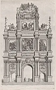 Plate 19: Triumphal arch, elevation of the front, surmounted by a cloud bearing Ferdinand and royal ancestors; from Guillielmus Becanus's 'Serenissimi Principis Ferdinandi, Hispaniarum Infantis...'