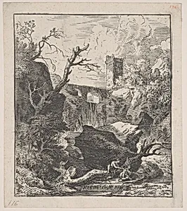 Plate 2: two figures sitting on a tree trunk on the bank of a stream in foreground, an aqueduct and tower in the background, from 'Landscapes in the manner of Gaspar Dughet'
