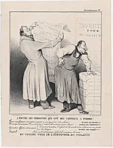 In 1838, French caricaturist Honoré Daumier contributed this sharp satire, *Plate 20: To with capital to lose*, *Caricaturana*, a series in *Les Robert Mac* by Charles Philipon printed by Aubert et Cie Daumier, a master of 19th-century political and social commentary, drew from the infamous duo of Robert Macaire—a cunning swindler—and his sidekick Bertrand, popularized in a 1834 play. Under King Louis-Philippe's July Monarchy, such prints in journals like *Le Charivari* lampooned corruption, greed, and the bourgeoisie, often skirting censorship through clever allegory. Rendered as a lithograp...