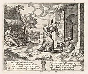 Plate 26: Psyche enters the underworld giving an offering to Cerberus, with two elderly women at left, from "The Story of Cupid and Psyche as told by Apuleius"