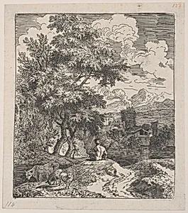 Plate 3: a shepherd seated on a hill, a cow and two sheep at left, and a town in right background, from 'Landscapes in the manner of Gaspar Dughet'