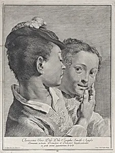 In the intimate etching *Plate 3: Boy a Hat Touching the Face of a*, from the series *Icones vivum expressae*Icons Expressed from Life"), Giovanniini masterfully reproduces a drawing by Venetian Rococo artist Giovanni Battista Piazzetta Created in 1743, this captures a tender, spontaneous moment between two children—a boy in a hat gently caressing a girl's face—evoking the playful innocence of youth amid the elegance of 18th-century. Piazzetta, renowned for his sensitive portrayals of heads and figures, drew from live models, infusing his works with lifelike warmth and emotional depth that def...
