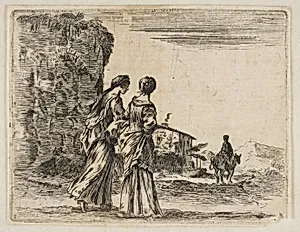 Plate 3: two girls walking towards the right, seen from behind, a woman on a horse to right in background, from "Diversi capricci"