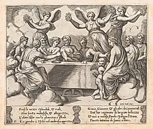 This engraving represents Plate 31 from a celebrated series of thirty-two prints depicting the legend of Cupid and Psyche, created between 1530 and 1560. The Master of the Die, an anonymous Italian engraver who signed works with a small die symbol, collaborated with Agostino Veneziano to translate drawings by Flemish artist Michiel Coxie (1499-1592) into this narrative cycle. Published by Antonio Salamanca, a prominent Roman print dealer, the series brought the beloved tale from Apuleius's 'Meta...