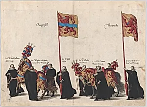 Plate 32: Men with heraldic flags and horses from Overijssel and Utrecht marching in the funeral procession of Archduke Albert of Austria; from 'Pompa Funebris ... Alberti Pii'