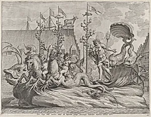 Plate 35: Philip of Spain as Neptune, riding in a chariot drawn by two sea horses; from Guillielmus Becanus's 'Serenissimi Principis Ferdinandi, Hispaniarum Infantis...'