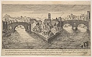 Plate 37: view of the church of San Bartolomeo all'Isola on Tiber Island, Rome, flanked by bridges, from the series 'Ruins of the antiquity of Rome, Tivoli, Pozzuoli, and other places' (Vestigi della antichità di Roma, Tivoli, Pozzvolo et altri luochi) by Aegidius Sadeler II|Etienne DuPérac