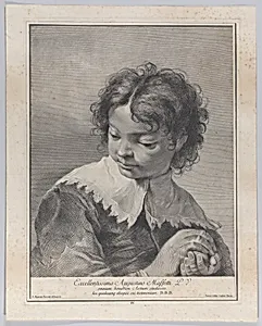 In the enchanting world of 18th Venetian art, *Plate 4: Boy a Lace Collar Holding a Piece of Fruit in Hands* from Giovanni Battista Piazzetta'sIcones ad vivumae* (1743) captures the innocence and charm of childhood. Etched by Giovanni Cattini after Piazzetta's original drawing this print showcases Piazzetta's mastery of Rococo portraiture, known for its lively, naturalistic depictions "ad vivum" or "from life." The boy, dressed in an elaborate lace collar evoking the opulence of Venetian nobility, gazes out with a gentle curiosity while cradling fruit—a symbol of youthful abundance and vitalit...