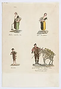 Plate 4: four street vendors from Madrid selling Albillas, radishes, carbon, from 'Los Gritos de Madrid' (The Cries of Madrid)