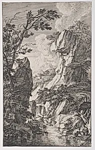 Plate 4: two fishermen on the bank of a stream at right, a waterfall at center, from 'Landscapes in the manner of Salvator Rosa' (Die Landschaften in Sal. Rosa's)