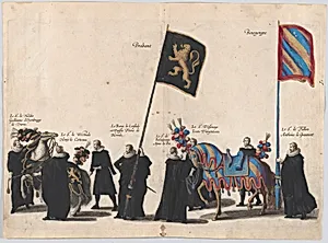 Plate 45: Men with heraldic flags and horses from the House of Brabant and Burgundy marching in the funeral procession of Archduke Albert of Austria; from 'Pompa Funebris ... Alberti Pii'
