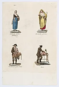 Plate 5: four street vendors from Madrid selling sweet albellanitas dulces, alacalienties, tender cuts and a knife grinder, from 'Los Gritos de Madrid' (The Cries of Madrid)