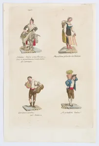Plate 6: four street vendors from Madrid selling navitos, muslin, fans, plants, from 'Los Gritos de Madrid' (The Cries of Madrid)
