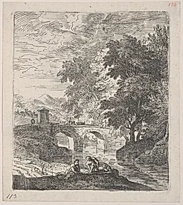 Plate 6: the stone bridge: a shepherd with two cows crossing the bridge, three male figures resting on the riverbank in the foreground, from 'Landscapes in the manner of Gaspar Dughet'