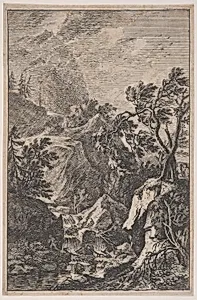 In this evocative etching,Plate 6* from Joachim Beich's series *Landscapes in manner of Salvator Rosa (ca. 1700–25), visitors are drawn into a dramatic natural scene. Two male figures perch boldly on a rocky outcrop at the right while a cascading waterfall dominates the center, with another solitary figure poised on its left bank. composition captures the wild, untamed beauty of, blending human presence with rugged terrain in a compact plate measuring just 9 7/16 × 6 1/8 inches. Beich, a German engraver active in the early 18th century, skillfully emulates the style of 17th-century Italian Ba...