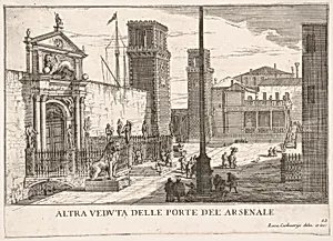 Plate 63: View of the gate of the shipyard and armory complex (Arsenale), Venice, 1703, from "The buildings and views of Venice" (Le fabriche e vedute di Venezia)