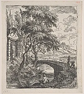 Plate 7: two figures at right about to cross a stone bridge, a fisherman in the foreground, from 'Landscapes in the manner of Gaspar Dughet'