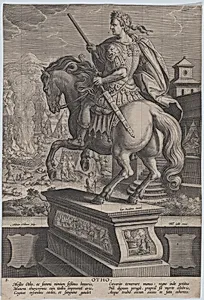 Plate 8: equestrian statue of Otho, seen from behind, his death scene in the background with him stabbing himself at right and the burning of his body at left, from 'Roman Emperors on Horseback'