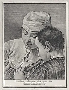 Plate 9: A youth playing the recorder while a man to the left holds up a music book; from 'Icones ad vivum expressae' after Giovanni Battista Piazzetta