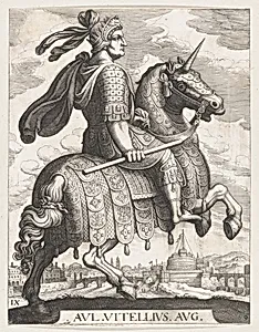 Behold Plate 9 from *The First Twelve Roman Caesars*, a captivating etching and engraving depicting Emperor Vitellius astride a noble steed. Created between 1610 and 1650 by Italian artist Antonio Tempesta, whose dynamic designs of horses and figures inspired the series, and Swiss master engraver Matthäus Merian Elder, this print measures 11 13/16 × 9 inches. Housed in the Metropolitan Museum of Art's Drawings and Prints department, it exemplifies the era's fascination with classical antiquity. Vitellius, Roman emperor in 69 AD during the "Year of the Four Emperors," is portrayed in equestria...