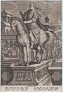 Plate 9: equestrian statue of Vitellius, seen three-quarters to the left, with his death scene in the background at right, his body being thrown into the Tiber at upper right, from 'Roman Emperors on Horseback'