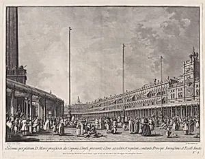 Step into the vibrant heart of 18th-century Venice withPlate 9: Process on Corpus Christi Day in Piazza San Marco*, from series *Ducalemonies and Festivals*Le Feste Ducali Created around 1766, this etching and engraving the grandeur of a solemn religious procession winding through the iconic Piazza San Marco on the feast of Corpus Christi—a key Catholic celebration honoring the Eucharist. Amidst the square's stunning basilica and soaring campanile, doges, clergy, and citizens in elaborate attire evoke the splendor of Venice's fading republic, blending faith, pageantry, and civic pride. Renown...