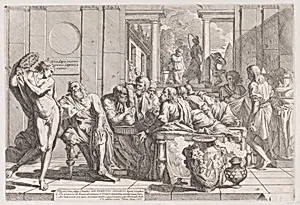 Plato's symposium: Socrates and his companions seated around a table discussing ideal love interruputed by Acibiades at left by Pietro Testa