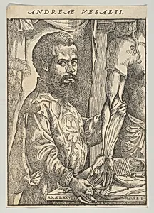 Portrait of Andreas Vesalius, half-length in profile standing in front of a table dissecting the arm of a body; frontispiece to Andreas Vesalius 'De humani corporis fabrica libri septem'