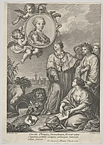 Portrait of the future Holy Roman Emperor Leopold II as the Archduke of Austria and Grand Duke of Tuscany, set within a roundel upper left, allegorical figures representing the arts and sciences below