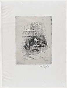 In this intimate etching, *Portrait of the Painter Eduardo Zamacois Seated at a Table*ca. 1869), Mariano Fortuny captures his fellow Spanish artist in profile, seated thoughtfully at a table. Fortuny (1838–1874), a master of luminous detail and exquisite technique, was a leading figure in 19th European art, blending Realism with Orientalist influences from his travels. This work, from the Metropolitan Museum of Art's Drawings and Prints department, showcases his skill in printmaking, with the modest plate size (7 1/16 × 5 7/16 in.) allowing for intricate lines etched into metal. Etching, Fort...