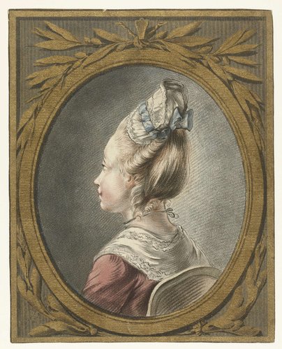 **Portret van een jonge vrouw (Portrait of a Young Woman is a delicate work by Louis Marin Bonnet a prominent French artist active in the late 18th. Created between 1774 and1793, this intimate portrait measures just 255 mm high by 203 mm wide, inviting viewers to lean in and appreciate its subtle nuances. Bonnet, known for his mastery of reproductive printmaking, captures the sitter's poised elegance in a style reflective of the Rococo's graceful refinement transitioning toward Neoclassicism. The standout feature is its "crayon method," or *crayon manner*—an innovative etching technique Bonne...