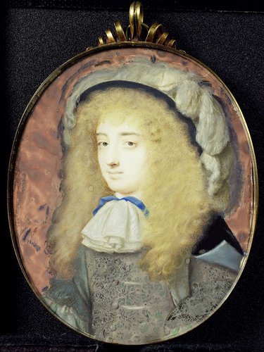 Portret van Frances Teresa Stuart (1647-1702), hertogin van Richmond en Lennox, in travestie. Buste, naar links. Onderdeel van de collectie portretminiaturen.