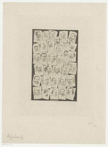 Henri Charles Guérard’s *Portretten van leden van de des gens de lettres* (1883) is a etching capturing portraits of members from one of France’s most influential literary societies, founded in 1838 to authors’ rights. Created during the vibrant Belle Époque, when Paris buzzed with intellectual exchange, this print immortalizes key figures from the literary world, reflecting the era’s reverence for writers and thinkers amid rapid cultural and social change. As an etching—a meticulous intaglio technique where acid bites into a metal plate to create rich, expressive lines—Guérard’s work showcas...