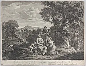 Primavera, a group of women collecting flowers and making crowns from them