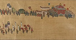 Behold *Procession*, a captivating handscroll from late 19th-century China during the Qing dynasty (1644–1911). This and color painting on silk, measuring 9 5/8 x 25 inches, depicts a lively procession featuring men and tents, evoking the grandeur of ceremonial events or festive gatherings common in imperial China. Unidentified in its artist, the work captures the rhythmic movement and communal spirit of such occasions, inviting viewers to unroll it slowly and immerse themselves in the unfolding narrative—a traditional format cherished for its intimate, sequential viewing experience. Handscro...