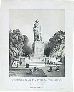 In 1845, American sculptor Thomas Crawford proposed this ambitious design for a colossal statue of George Washington to grace New York City, capturing the era's fervor for monumental tributes to the nation's founding father. Rendered as a tinted lithograph by printers Frederick Catherwood, G. Thomas, Francis Michelin, and publishers Bartlett & Welford, the image depicts Washington in heroic neoclassical pose amid trees, evoking Roman emperors and symbolizing enduring American ideals of liberty and leadership. This print, from the Metropolitan Museum of Art's Edward W. C. Arnold Collection, served as a powerful promotional tool, rallying public and civic support for grand public art in a young republic eager to rival Europe's landmarks. Lithography with tint stone—a technique using colored stones for subtle hues—brought the sculptural vision to life on paper, making the towering figure accessible and vivid. At over 16 inches tall in image size, it highlighted Crawford's skill in blending classical grandeur with patriotic symbolism, though the statue was never realized at this scale. Today, it offers a window into 19th-century urban aspirations and Washington's mythic status, reminding visitors how prints like this fueled cultural debates on national identity and commemoration.