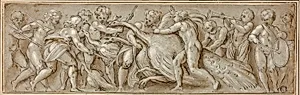 Pen and brown ink with brush and brown wash, heightened with lead white, on blue-gray laid paper, laid down on ivory laid paper, laid down on gray card