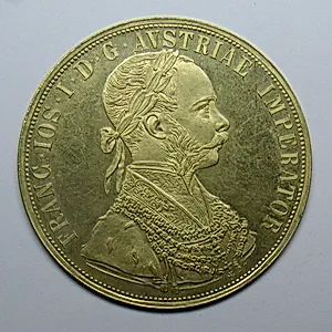 Behold the *Quad Ducat of Francis Joseph I, Emperor of Austria*, a 19th-century gold that gleams with imperial grandeur. Measuring an impressive 2¼ inches (57 mm) in diameter, this oversized piece—four times the value of a standard ducatserved not just as currency but as a symbol of Habsburg prestige. Minted during the long reign of Francis Joseph I (18481916), who ruled the vast Austro-Hungarian Empire, it reflects the era's economic might and monarchic authority. Crafted in pure gold, the coin showcases exquisite engraving techniques typical of Austrian minting. One side likely features the emperor's dignified profile, capturing his stern yet regal visage, while the other displays the imperial coat of arms, emblematic of dynastic power and heraldry. As a work of decorative art, its large scale and fine detailing elevated it beyond mere money, often used for ceremonial gifts or state payments. Now housed in the Metropolitan Museum of Art's Department of European Sculpture and Decorative Arts—thanks to a 1909 gift from H.R. Ickelheimer—this coin invites us to ponder the artistry of empire. In a museum setting, it bridges numismatics and sculpture, reminding visitors of how everyday objects embodied 19th-century Europe's political splendor.