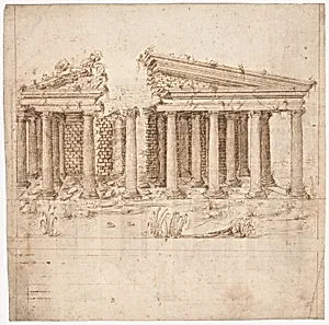 Recto: Front Elevation of a Roman Temple in Ruins (inspired by Giuliano da Sangallo); Verso: Elevation of the Nave of a Roman Basilica in Ruins (? the Basilica Giulia, inspired by Giuliano da Sangallo).