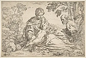 Rest on the flight into Egypt, Mary holding the infant Christ with St. Joseph at right