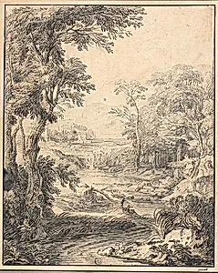 River Landscape with Two Figures in Foreground, Castle in Distance