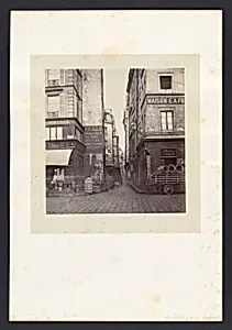 Step back into the narrow, teeming alleys of 1860s–70s Paris with Charlesville's *Rue Mondétour, de la Rambuteau*. This albumen silver print a glass negative captures a street scene: cobblestone pavement flanked by weathered buildings, wooden carts, and stacked barrels, evoking the rhythm of urban life in the city's historic heart. Marville served as the official photographer for Baron Haussmann's sweeping urban renewal under Napoleon III, tasked with recording Paris's medieval neighborhoods before they were razed for wide boulevards and modern infrastructure. Streets like Rue Mondétour and R...