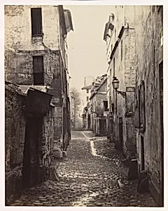 Step into the shadowy lanes of old Paris with *Rue Traversine (from the Rue dras)*, a captivating albumen silver print by Charles Marville, created 1868. This 34.8 x 27.5 cm photograph captures a narrow, winding alleyway lined with weathered buildings, evoking the intimate, medieval fabric of the city before its dramatic transformation. Marville, Paris's official photographer under Napoleon III, masterfully used a glass negative to produce the rich tonal depth and exquisite detail characteristic of albumen prints—the dominant photographic process of the era, prized for its clarity and subtle g...