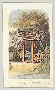 Step into the lush greenery of New York's fledgling Central Park with *Rustic Arbor*, a delicate color lithograph from Louis Prang & Co.'s 1864 series *Views in Central Park, New York, Part *. Created just six years after the park's opening in 1858, this tiny print (measuring a mere 4 × 2⅜ inches) captures a picturesque rustic arbor framed by trees, with figures of men adding a touch of everyday life to the scene. Central Park, designed by Frederick Law Olmsted and Calvert Vaux as an urban oasis, symbolized democratic leisure amid rapid industrialization, and such views celebrated its idyllic ...