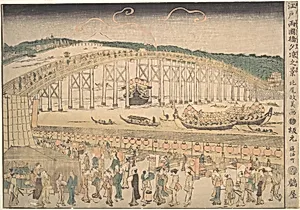 Kuwagata Keisai's *Ryogoku Bridge*ca. 1780) is a vibrant woodblock print capturing the bustling energy of Edo-period (1615–1868) Tokyo along the Sumida River.ogoku Bridge, a wooden span, was a hub of urban leisure, where crowds gathered for fireworks displays, boating excursions, and festivals. As a disciple of the pioneering ukiyo-e master Harunobu, Keisai specialized in these "bridge prints," offering affordable glimpses into the "floating world" of pleasure and everyday life for a wide audience beyond the elite. Rendered in ink and color on paper, the print measures 11 5/8 x 16 5/8 inches ...