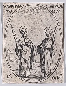 This delicate etching, *S. Martinien et S. Saturien (St. Martinian and St. Saturnian), October 16th*, comes from Jacques Callot's renowned series *Les Images de Tous les Saincts etes de L'Année* (Images of All Saints and Religious Events of Year), published in 6. Callot, a masterful French Baroque printmaker, collaborated with publisher Israël Henriet to create these tiny devotional images, each honoring a saint or feast day. Measuring just 2 9/16 x 1 15/16 inches, this second-state impression captures the martyrs Saints Martinian and Saturnian—early Christian figures venerated for their faith...