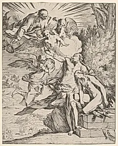 Sacrifice of Isaac: an angel presses against the dagger-bearing arm of Abraham, who stands next to Isaac on an altar, God the Father and an angel bearing a lamb approach from the left