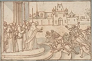 In this delicate drawing, *Saint Bernard presenting the host to X, duc de Guy*, Sébastien Leclerc I captures a pious moment from medieval history. Created in pen and brown ink with brush and gray wash over chalk, the small sheet (just under 3 by 4½ inches) showcases Leclerc's mastery of mixed-media techniques. The artist, a prominent French Baroque draftsman and engraver active in the late 17th and early 18th centuries, often produced such works as studies for engravings or royal commissions at Versailles. Framing lines in ink suggest it was prepared for reproduction, highlighting its role in ...