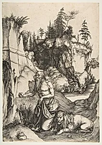Albrecht Dürer, a pioneering figure of the Northern Renaissance, created *Saint Jerome Penitent in Wilderness* around 1496, showcasing his mastery of engraving. second-state print depicts the fourth-century Church Father Saint Jerome in contemplative solitude amid a rugged landscape. Traditionally shown with a lion—symbolizing a legend where he removed a thorn from its paw—Jerome kneels in penance, surrounded by attributes like a skull, crucifix, and open Bible, evoking themes of mortality, redemption, and scholarly devotion. Dürer's engraving technique revolutionized printmaking, using fine ...