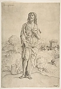 Saint John the Baptist standing in landscape, figures and buildings in the background